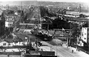復興事業によって整備された桜木町通りに荷車、自転車、馬車、自動車、路面電車が並ぶ。