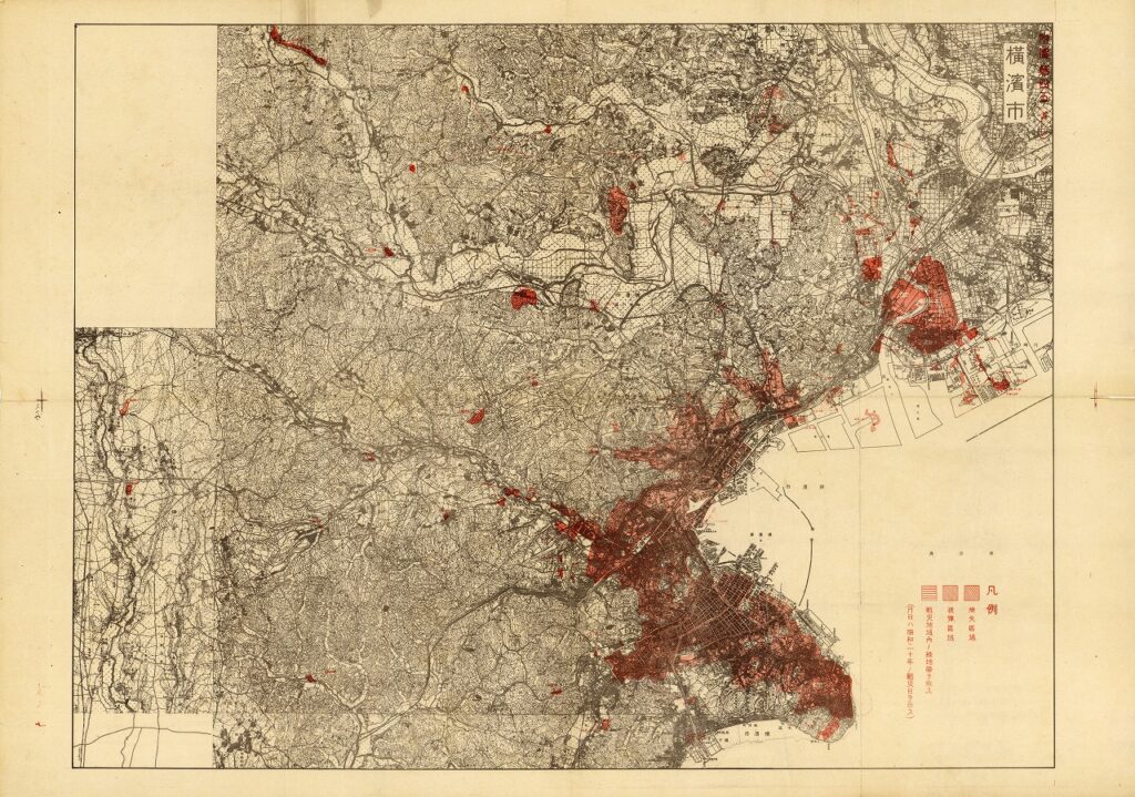 関東大震災の直後の火災による焼失区域を示している。震災によって、市街地の中心部は大きな被害を受けた。