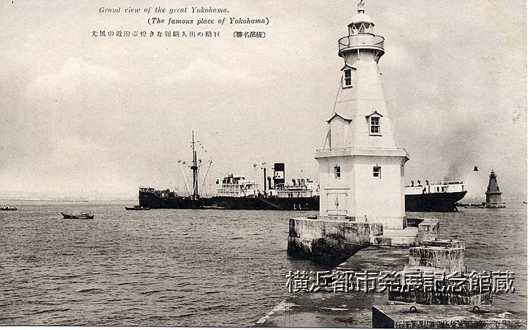 東水堤の先端に位置した白灯台(現在は氷川丸のそばに移設されている)。向かいに北水堤の先端に立つ赤灯台が見える。絵葉書は1933(昭和8)〜45年の刊。