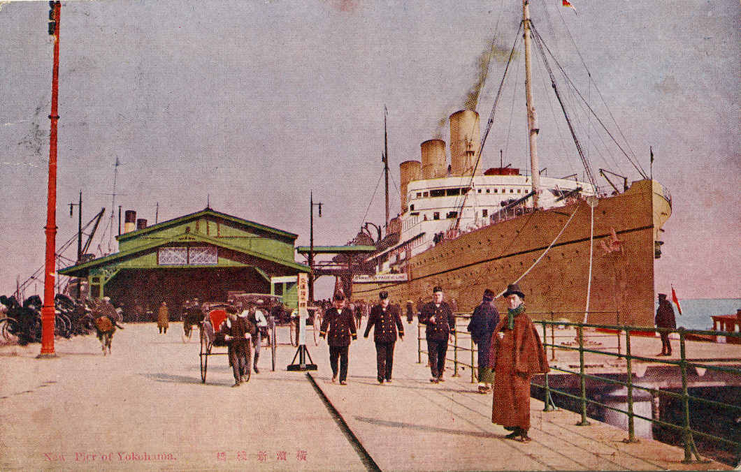 絵葉書の形状から1907(明治40)年から1918(大正7)年までに発行されたもの。新港埠頭は1914年に陸上施設が完工した。英文キャプションには"Custom Holse(Houseの誤) at Yokohama"とある。トンボヤ製。