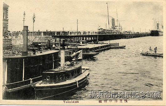 大さん橋の光景。さん橋上には1917(大正6)年に建造される上屋がまだ見えない。左にわずかに見えるレンガ造りの建物が横浜税関監視部(関東大震災で倒壊)。絵葉書は1907(明治40)〜1918年の刊。明治時代終りから大正はじめの撮影と考えられる。手前に見える小蒸気船は港内の巡視などをおこなった。