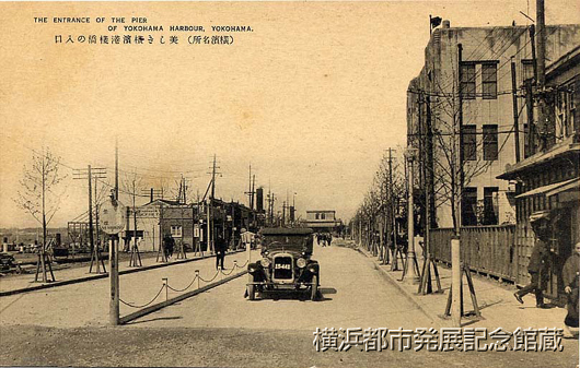 正面奥に大さん橋の第1号上屋(1928年築)が見える。右手の3階建ての建物は水上警察署。絵葉書は1933(昭和8)年までの刊。