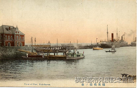 当時の新聞より(明治時代後期の大桟橋):「「書生さん……乗つてツて呉れませんか……」  リキシヤマン君はヨク頼んだものだ。それは彼らの簡単なトリツクであつた。空車を引いて桟橋へ入る事は許されなかったから、彼等は誰か気軽な人間を物色しては仕事の豊富な桟橋へゆくべく税関の門を潜る口実を得やうとした。(中略)その頃の桟橋は木造であつた。陸に近い半分は横に木が渡してあつた。だから歯のある下駄では一寸以上もある隙間へ歯が落ち相でボンヤリ歩かれなかつた。海へ出た他の半分は縦に流れてゐたので比較的歩きよかつた。  桟橋へ繋留する船は大概ジヤマンメールやフランスメールであつた。これ等は一万噸近い巨い船で郵船など一隻も所有せぬ様な優秀船であつた。大して古い事ではない日露戦争前後の話である。」(「浜のゑがほ」『横浜貿易新報』1927年11月17日)