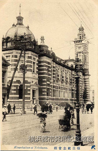 1917(大正6)年に福田重義設計で竣工した開港記念会館だが、1923年の関東大震災で屋根・ドーム・創建時のインテリアを失う。この写真はドームが写されていることから、1917年から23年の間の景観と考えられる。この頃の記念会館は音楽会、講演会などに利用された。トンボヤ製。