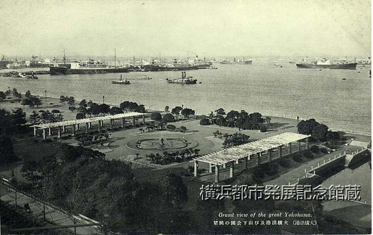 - 「横浜市の復興計画に基き復興局が施行中の海岸通りの山下公園は造園工事全く成つて十五日午後二時から開園式を挙行される事となつた。(中略)尚同公園は最初震火災の焦土捨場として許可されたものに去る大正十四年六月護岸工事を開始、山手トンネル、大岡川の浚渫土砂二万五千立坪を以て埋立を進め工事進捗に伴ひ部分的に開放され来つたもので此の総工費六十七万円と称され本市に於て有数な公園として実現するに至つたのであるが一方面積は二万二千五百坪、輸出獣類検査所跡は千坪のボート溜とされ(中略)特に全園の道路辺りには各種の躑躅数万本を植えられてゐる」(『横浜貿易新報』1930年3月12日)