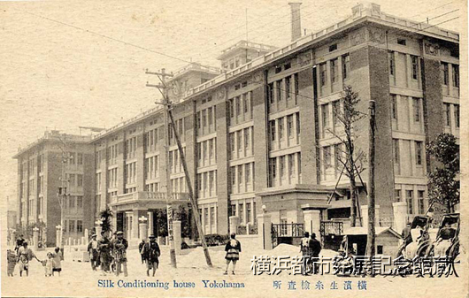 雪の積もった横浜生糸検査所。北棟増築(1931年)以前の撮影。画面中央の電柱に張り付けられた広告は「吉川靴店」と読める。宛名面には「之ハ港ノ近クニアリ」と毛筆のメモがある。