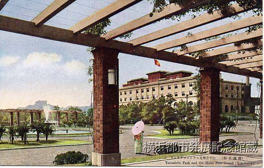 山下公園のパーゴラからホテル・ニューグランドを見る。屋上階の増築(J.H.モーガン設計)がなされていることから、1933(昭和8)年以降の景観。