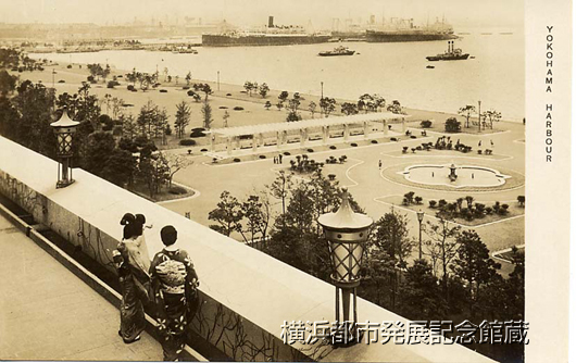 モーガンによる増築(1933年)前のホテル・ニューグランド屋上から見た山下公園と横浜港。"JAPANESE GOVERNMENT RAILWAYS"発行。