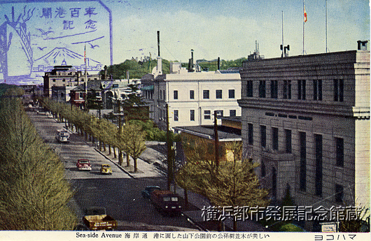 「開港百年記念」のスタンプが押されている。正面右はモーガンによって設計された香港上海銀行横浜支店(1933年)。スタンプの下がホテル・ニューグランド。