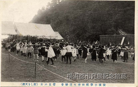 1925(大正14)年10月15日におこなわれた横浜小学校秋季大運動会の記念絵葉書。松島写真館発行。