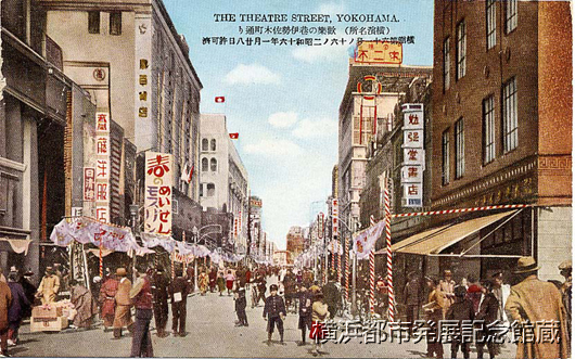 - 右手前の茶色のビルは横浜名物の喜楽せんべいの店舗。その隣に勉強堂書店の看板、さらに奥に不二家が見える。その2店舗の間にサクラサロン(カフェー)があった。左手中ほどの白い建物が寿百貨店。もともと所在した越前屋は、1932(昭和7)年5月に負債を抱えて店を閉じた。12月に合名会社山越として再開するが、1934年に閉店。店舗は松屋(吉田橋に横浜店があった)が購入し、同年6月鶴屋として開店したが、7月寿百貨店と名称を変更した。画像は1934年以降の景観か。
