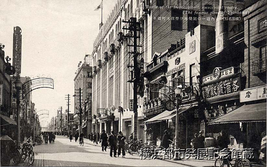 - 通りの右側正面が野澤屋百貨店。その手前は桜井薬局、五味時計店。画面左手には有隣堂がある。野澤屋の伊勢佐木町支店が開業したのは1909(明治42)年11月1日。1921(大正10)年、福富町側に鉄筋コンクリート4階建ての店を建築。関東大震災後、伊勢佐木町側の旧館がつぶれたため、ここに鉄筋コンクリート造りの新館を建築(1927年5月)、以後何度も増築をおこなった。現在の建物の伊勢佐木町側正面は1937(昭和12)年に完成した。