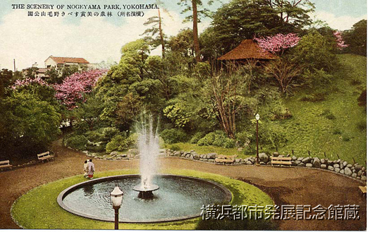 - 「相当古びついたが 野毛山公園 渓流の木蔭から 急に動く画中の男女<BR> ◇<BR> 公園らしい公園のなかつた横浜人は、震災と云ふ大難に見舞はれた代償として野毛山公園を得た。<BR> ◇<BR> 此頃行つて見ると、都会の公園に有り勝なわざとらしさも殆ど消え失せて多少の古びがつき、総てがよくなつた。芝生にも植木にも落ち付きが出来た。噴水の水も渓流の水も一様に自然的な味を出してゐる。歩いてゐる人間も『公園散策人』らしい多種多様な恰好をしてゐる」<BR> (「浜のゑがほ」『横浜貿易新報』1927年12月1日)