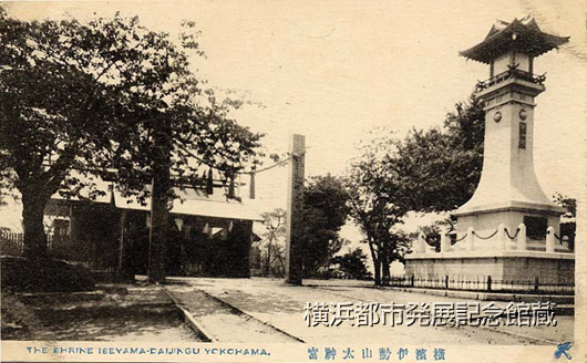 当時の観光案内より:「横浜の総鎮守として全市民の敬神の的となつて居る。日本造りの神々しい神殿は参拝者の襟を正さしむ。展望は港を眼下に収めて絶佳である。」(『横浜の市勢』横浜市産業部、1940年)