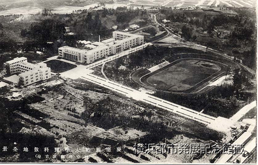 慶応義塾の予科移転決定(1929年)後、それまで買い手がつかなかった日吉台住宅地の売り上げは急上昇する。「神奈川県日吉台 大学予科第二校舎落成記念絵葉書 昭和十一年六月」と題された絵葉書セットの1枚。