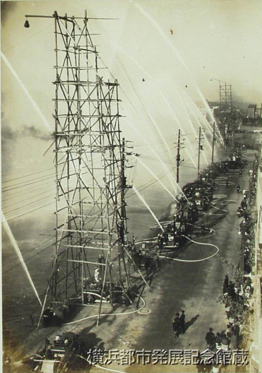県消防協会主催の「防火デー」は一日全県下を通じて一斉に各種の催をして防火思想の普及につとめたが、横浜では午前九時を期して吉田橋際に市内全署が集合、警察部長の点検の後防火、並に救助の各作業を実演して放水試験を行ひ、午後からは百余台の自動車行進でサイレンの音も勇ましく防火宣伝を行つた。 (写真は放水の実況)