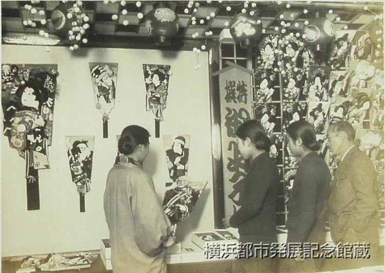 羽子板が街頭に出ると暮の気分がいよいよ深くなる五日から各デパートを始め一斉に陳列を始めた。今年よりも一体に型の大きいのが流行るらしく、絵柄も東郷元帥やベーブ・ルース等変つたものが大分出て来た。 写真は 野沢屋にて