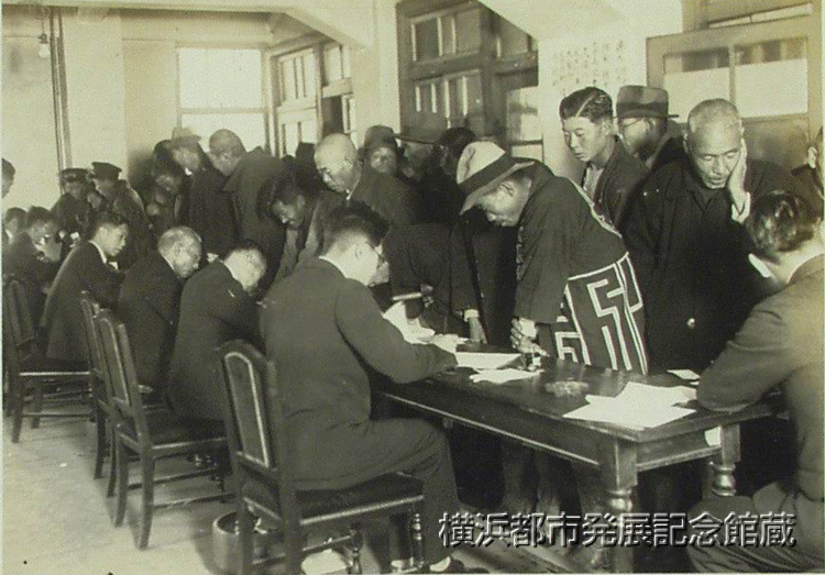 市が卅五万円を計上して八千の失業者の為め計画された冬期救済工事は、今年は東京川崎に此の事業がないので当地へ稼ぎに来ないとも限らないので、『本市に三ケ月以上居住し現在失業中の労働に堪へうるもと(ママ)』といふ条件の下に、五日から市内十七ケ所に於て受付登録をなし、採用者には写真付の労動(ママ)手帳を交付して救済の徹底を期すこととなつた。 (写真は登録の受付中央職業紹介所)