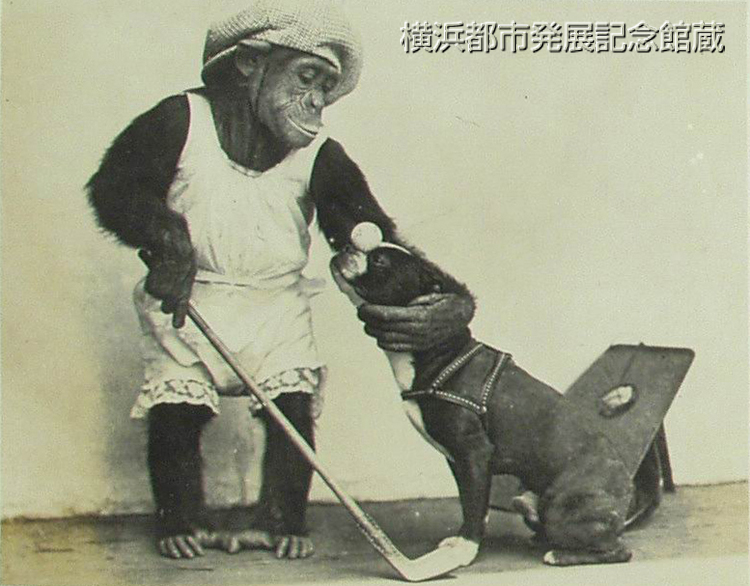 『ハロウ』と明春博覧会が始まるトタンにイトモ愛嬌のある顔をつき出して、「ニツポンの坊ツちやん嬢ちやん」にゴ挨拶をするキネマの都ハリウツドに其の名を知られたるヂンパンヂー(ママ)(類人猿)氏、当年八才、あちらの尋常一年生であるが、彼氏とて本場社交界の花形、食卓に付けばアメリカの小笠原流かなにかでホーク・ナイフの手さばきも鮮やかに、又食後には経(ママ)いラツキー・ストライクかなんかの煙を鼻から出して新聞を倒に見る、といつた様な「ターザン」も顔負けする類人ぶり、さて、引続いて玉乗り自転車の曲乗りを御に(ママ)入れます。 (写真は親友ブルドツク氏の頭の上にゴルフのボールを置いてまさにクラブ一振り天空高く擾飛ばさんとするヂンパンヂー(ママ)氏と同道して来る剽悍無比アメリカインデアンの一族及び投縄や馬の飛乗り等かつて日本で見られなかた(ママ)冒険をやるカウ・ボーイの一行)