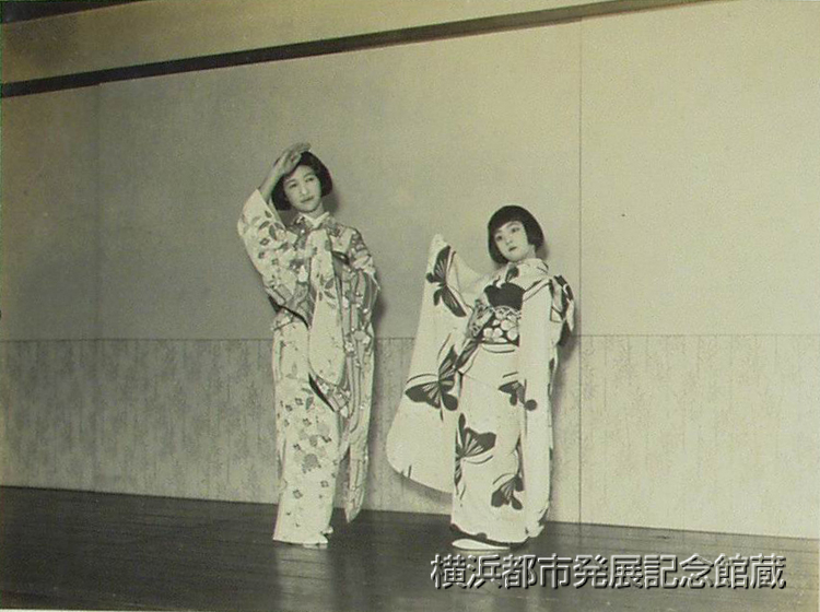 かねて博覧会事務局が懸賞で全国より募集した博覧会宣伝歌のうち、一等当選の横浜小唄は大澤徳雄氏が作曲、花柳花輔さんが振付してゐるが、此れは同じく当選唱歌と共にレコードにも吹込み、児童にも教へる筈であるが、廿日から向ふ (ママ)ケ月間伊勢佐木町の横浜常設館で花輔師指導の下に八人のハマ美人が出演してステージより『復興音頭』の普及につとめることになつた。 (写真は復興音頭振付考案中の三味線の杵屋初枝さんと舞踊の花柳花輔さん