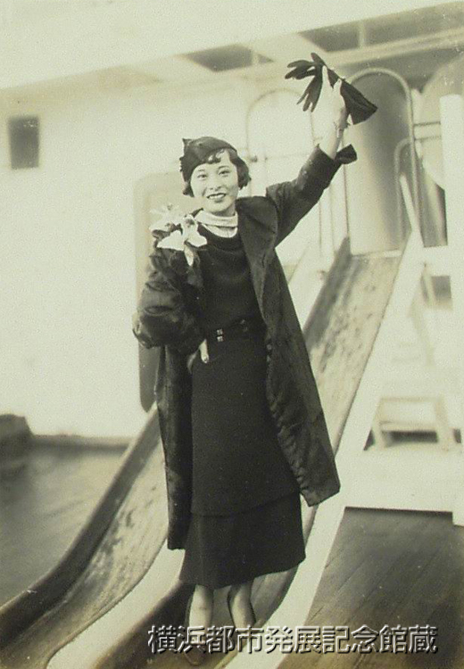 コロムビア専属ジヤヅシンガーベテイ稲田文子(22)さんは十三日入港の郵船浅間丸で帰朝したが、同嬢は昨年六月再渡米の上ハリウツドに滞在、フオツクス並にR.K.O.トーキーに籍を置いて映画を研究 更に帰途布哇に立寄りハワイアン・フラを習得、日本のステージから土人風俗の侭のフラ、ダンスで大いに悩まさうと云ふ魂胆。 (写真は浅間丸甲板にてイツトを発散させてゐるベテイ稲田さん)