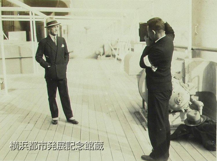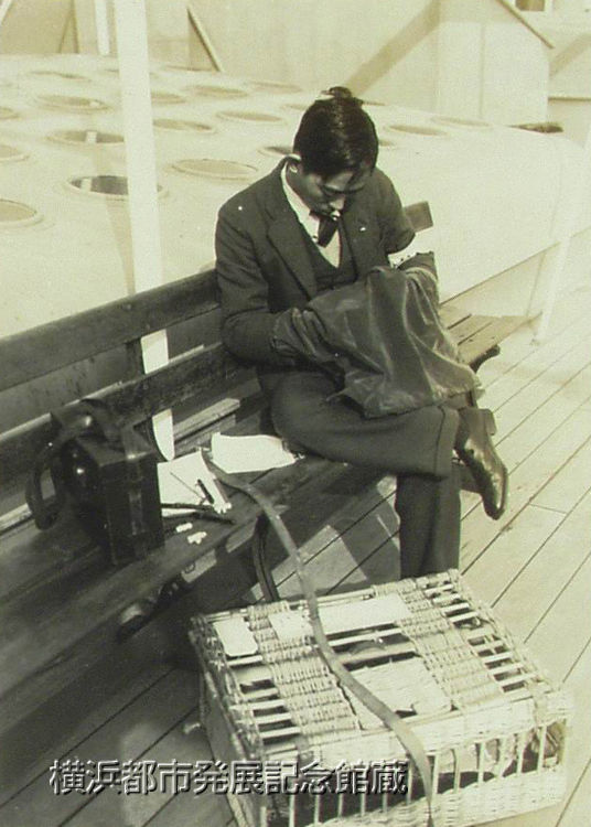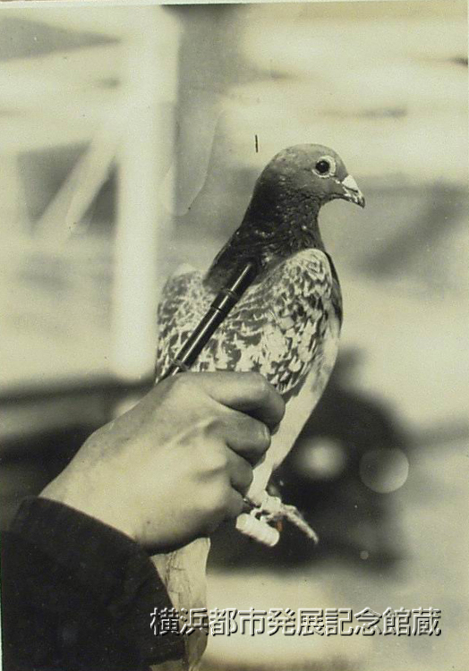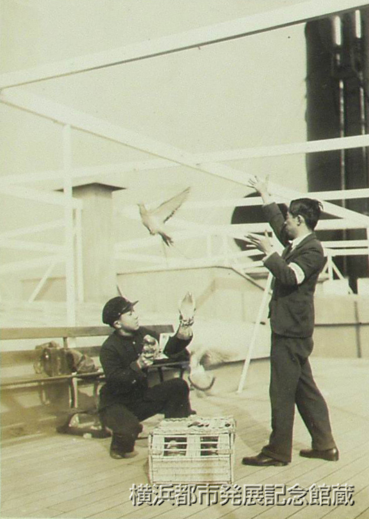 日本では各新聞通信社が近距離の記事急送用としていづれも伝書鳩を使用してゐるが、屡々米本国との往復に横浜に寄港する比島体育協会長、比島上院議長マニエル・ケーゾン氏は入港に際し、各新聞記者が港外にて検疫船と共に乗込み、同氏を始め各名士連のインタービウ並に写真を撮り直ちに携帯の伝書鳩に託して本社に送る状況を目撃し、又正午頃入港した場合直ちに上陸し電車にて東京駅に着けば早くも其の写真を掲載せる夕刊が発行されてゐる等の事実に感嘆し、之れを未だ使用してゐないニユウヨーク・サンフランシスコ等全米の各海事通信員連盟に紹介すべく、米国ダラー汽船会社横浜支店長タムスン氏を通じて希望を述べたのでは(ママ)、本社では伝書鳩の軍事上の重要性に鑑み一応考慮の上応諾し、十三日早朝入港のプレシデント・クーリツヂ号上に於て伝書鳩使用の実況を十数種の写真に撮影して。