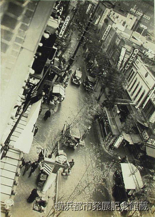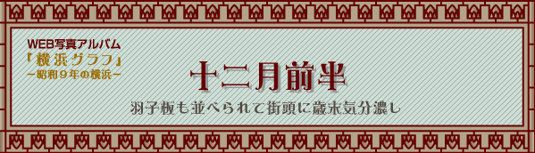 一年間の帳尻を無理にも合せなければならぬ年の暮、それも余すところ十日許りになると、のつぴきならぬ歳末の緊張が街頭いたる所にあふれて来るから妙だ。そこで歳末の景気はどうかと言へば、重工業の隆盛か適面(ママ)に響いて上層と下層との懐が温く、中層のサラリーマン連はあまりパツトしないらしいが、とにかく暮は暮、自然お買物も多いわけで、これからの一週間が商人の最後の一戦といふところ。今の所大したこともないが、今年は尻つぱねが想像されてゐるだけにみんな手ぐすね引いてゐるわけ。 (写真は暮の街伊勢佐木町通にて)