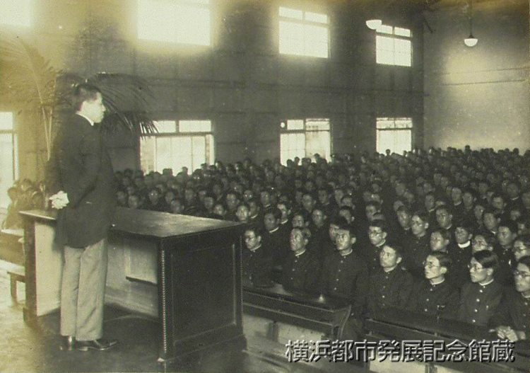 横浜専門学校から招かれた現代雄弁の権威拓務大臣永井柳太郎氏は十六日午后二時自動車で来浜、六角橋の同校講堂に溢れる一千余名の学生並に鬼頭横浜裁判所長以下来賓の拍手を浴びて登檀。「校長の林検事総長に招ばれたので検事局に引張られるのかと思つたら横専に連れてこられた」と軽く冒頭し、一流の雄弁をもつて個性の尊厳と日本民族の使命と題し滔々一時間余り懸河の弁を揮つたが、終つて来賓職員との茶話会に於て懇談して帰京した。