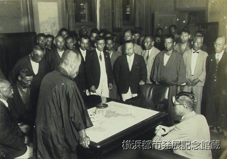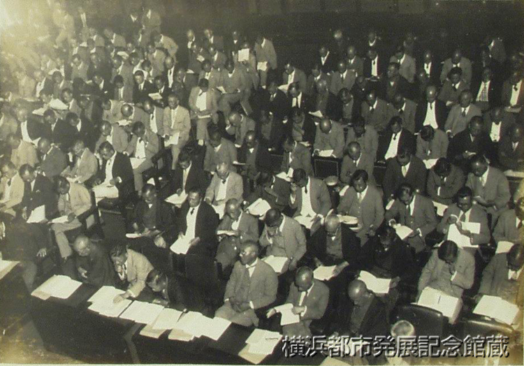 十八日招集された県下四市七十五ケ町村のお歴々の市町村長会議は午前十時県会議事堂に於て開催、横山知事の改正衆議院議員選挙法の実施に就いての注意を強調せる訓辞に次いで、各部課長の指示事項説明あつて正午開港記念会館にて知事招待の午餐会に望み、午後両会商工業組合の普及促進に関する件外十七件の注意事項及び質疑応答を行ひ同三時散会したが、横山知事は先般優渥なる勅語を賜はつた初等教育の作興に当つては特に全力を尽す可く力説した。 (写真は会議中の町村長)