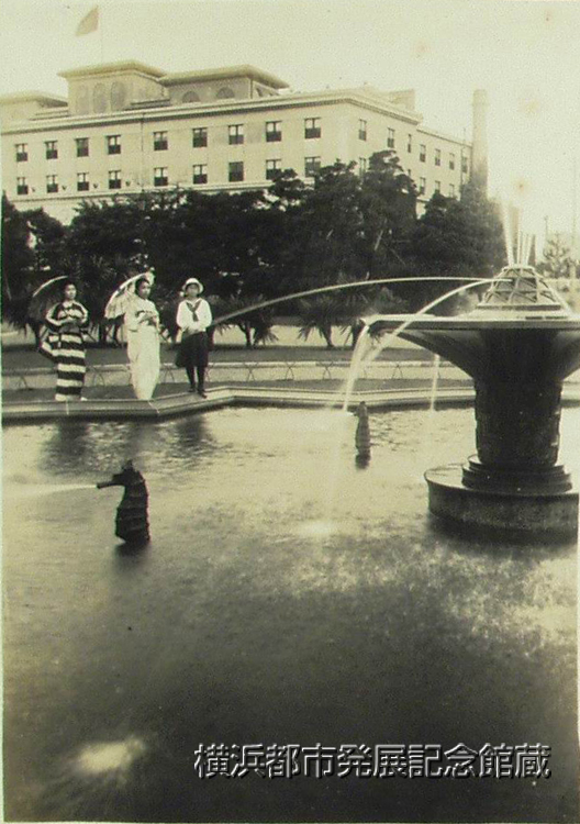 《解説》 背後の建物は昭和2年(1927)竣工のホテル・ニューグランド。