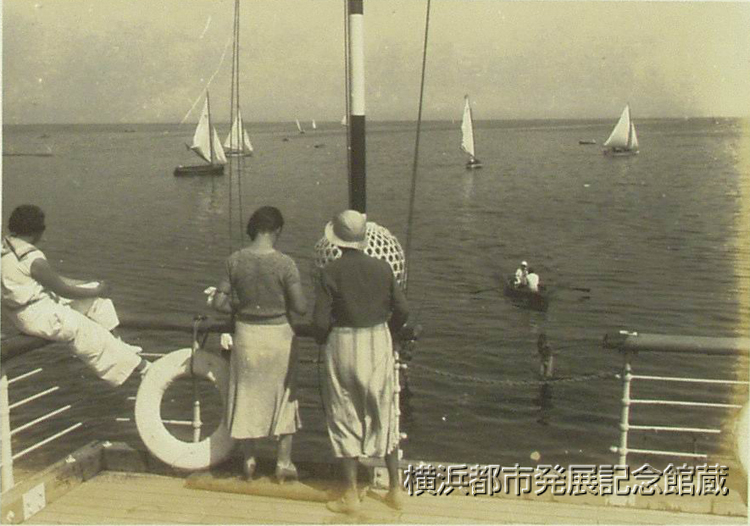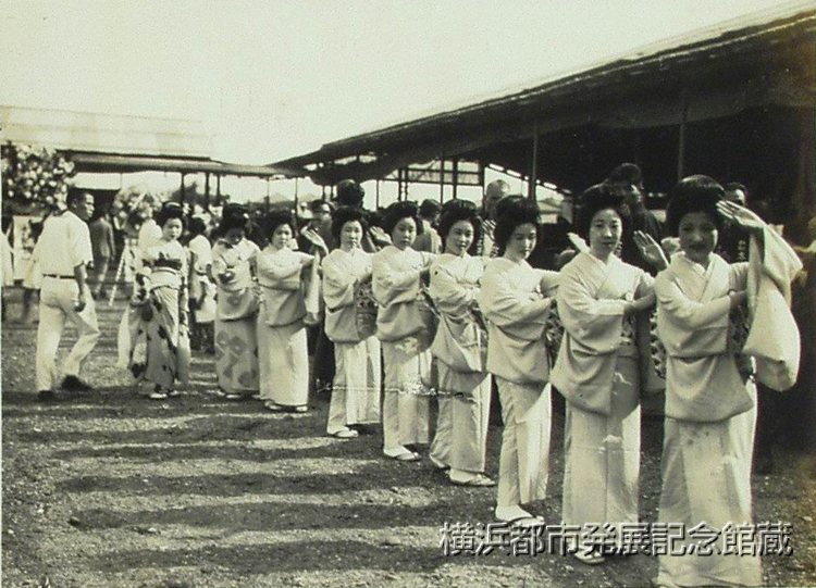 夏の殿堂として本牧「海の家は」(ママ)モダン瀟洒な白亜の姿を本牧海岸に現はし、あらゆる文化的施設完く成つて、卅日午后一時から戸井代議士以下発起人株主 原.矢島.亀井の諸氏始め、県市当局及び市内有力者一千名招待して盛大な開場式を挙行。当日は平塚委員長以下係員の大童の接待に専属マリン・ガールやサロンの女給及本牧芸妓の超特サービスで来会者を満喫させたが、一般開場は七月一日からである。 (写真は同日余興本牧おけさ踊り)