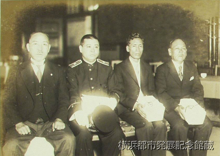 県下警察・消防署長会議第二日は廿日県会議事堂に開催。衛生.建築工場に関する指示注意並に諮問事項二件を議了。午後は裁判所会議室にて続行松井検事正の訓示の後、優良警察官として保土ヶ谷署長中村忠勝氏.刑事課智能犯係丸西芳郎氏 強力犯係荻原幸吉氏に対して表彰状及紀念品を授与され終つて、博雅亭に於ける検事正招待の晩餐会にのぞんだ。 (写真は向つて右から荻原.丸西.中村の三氏と松井検事正)