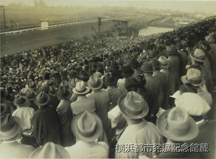 《解説》 根岸競馬場の馬見所は昭和4年(1929)に再建、昭和9年に増築され、一等・二等あわせて1万6500人の大観衆を収容した。