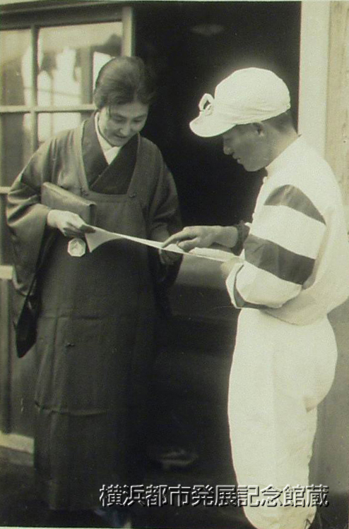 関東競馬のトツプを切つて横浜名物根岸競馬は清澄の気みつる絶好の競馬日和に恵まれ、更に人気馬の出場と程よき馬場のコンデイシヨンに愈々フアンを煽り立て、廿日第一日早くも人気は沸騰して一、二等も満員の賑ひで、こゝ当分は競馬マニアの心臓を高鳴らせるであらう。 (写真初日第一競馬と、厩舎を訪れて予想を聴くある競馬狂マダム)