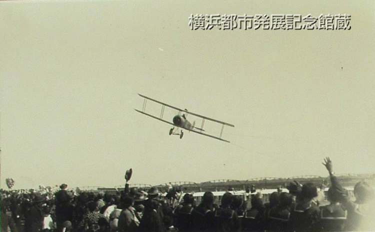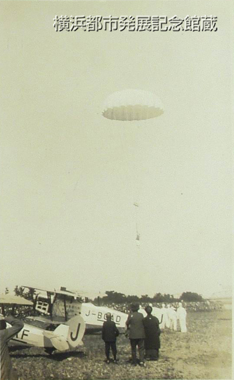 大日本義勇飛行会が全国児童から集めたタバコの銀紙一万四千貫に依つて購入した少年義勇号三機と、厚木の相模川畔に建設された義勇飛行場の披露祝賀会は、廿一日午前十時から賀陽宮邦寿王、治憲王両殿下御台臨の光栄に浴して、万国旗と紅白張幕に飾られた厚木全町に近郷より押しかけた三万の観集(ママ)と県下有力者並に飛行関係者等二千の来賓とで、さしもの飛行場も大半を埋められてしまつた。式は副会長奈良原男爵の開式の辞により義勇号三機の進空式を行ひ、高等飛行、落下傘降下等あり、終つて祝宴に移り会長野田男爵の挨拶あつて午後一時目出度く終了したが、この飛行場は厚木町の在郷軍人、青年団小学児童等の労力奉仕で出来上つたもので、現在すでに八名の少年航空士を養成中である。 (写真は左御台臨の賀陽宮両若宮殿下と義勇号の児童への感謝飛行、右は西山寿美子嬢のパラシユート)