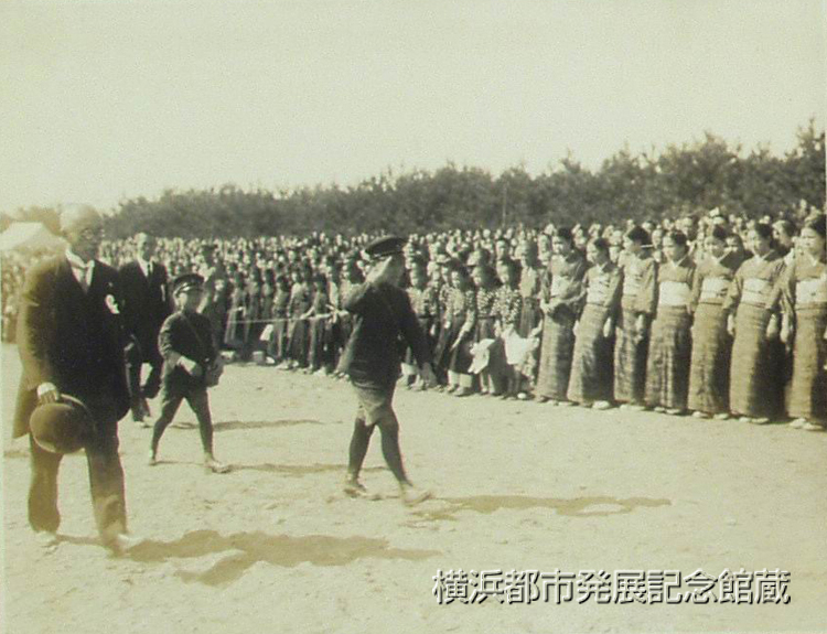 明春開催される横浜復興博覧会はすべての準備を順調に進めて、三十日には事務局を山下公園際の新庁舎に移転、本月五日いよいよ会場の地鎮祭を盛大に挙行することになり、事務局では加藤木事務長以下大童で当日の仕度に忙殺されてゐる。 (写真は博覧会正門の配景図と当日鍬入式に仮初の儀をつとめる童女篠崎和子、小宮博子さんの予習)