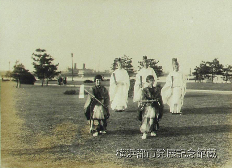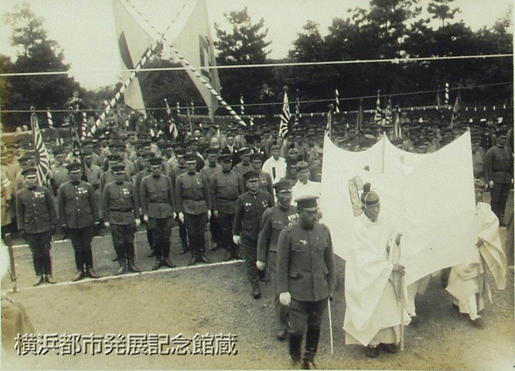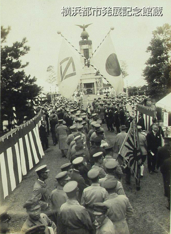二十五日午前十一時から保土ヶ谷児童遊園地忠魂碑前で恒例の招魂祭を挙行した。斉主大西市長を初め市出身の戦病没軍人遺族五百余名、来賓として横山知事、市内各官公民代表、柳川第一師団長甲府連隊司令官、横須賀鎮守府参謀長、団体参加としては甲府連隊市出身現役兵二百余名、在郷軍人、青年団、専門中等小各学校学生生徒、児童、約三千名参列し、過般日支、満州事変で戦死した四勇士の合祀祭を行ひ、次で招魂祭に移り市長の祭文師団長その他の吊辞ありて正午終式した。余興として素人角力ありて、時ならぬ遊園地の賑ひを呈し、横須賀海軍飛行機は特に飛来して空より吊意を表して引上げた。 (写真は合祀祭と招魂祭)