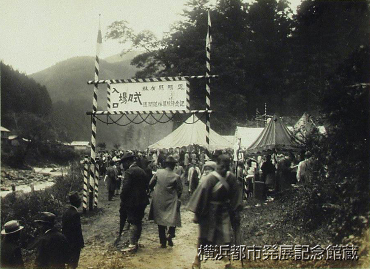 千古の森林天然の宝庫・丹沢山は往年聖恩によりて神奈川県財政の逼迫せるを、御救恤の有難き御思召によつて県有林として御下賜になつたので、予て此の宏大無比の天恩を永久に記念せんものと記念碑建設中であつたが、漸く此の程竣工したので、愈々去る二十六日午前十一時から紅葉に彩られる東丹沢札掛地内の同記念碑前に於てその除幕式を挙行した。湯浅宮相代理、津村帝室林野局東京支局長、横山知事以下各部長、山県元本県知事、本県貴衆両院議員、三木・郷正副県会議長その他地方有力者の参列あり。湯浅宮相の雄筆と国府犀東氏の碑銘で異彩を放つ。次で林道竣工式を挙行し、木暮林務課長より工事報告を為し、各式辞祝辞ありて関係五ヶ町村よりなれる祝賀会に移り、宮瀬小学校にて祝宴を張り、地方有力者は来賓を貯本(ママ)場、製材場等に案内し、此日丹沢の全山は挙げて歓声を響す有様であつた。 (写真は記念碑と林道開通式)