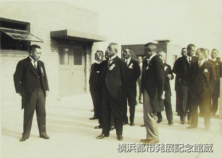 横浜郵便局は震災から十有余年公園の隅にバラツクのまゝ港都の復興に取り残されてゐたが、昨年六月より工費六十一万円を以て日本大通りの一角に工を起して十六ヶ月目の今日二十九日午前十時から本省より床次逓相を始め朝野の名士六百余名を招いて盛大な落成式を挙行したが、同局は鉄筋コンクリート四階建(一部六階)総延坪二、四五〇タイル張りの壮麗なるもので国際都市中枢局としてはづかしからぬものである。 (写真は同祝賀会場にて、右から横浜郵便局長、東京逓信局長、政務次官、逓相、本県知事)