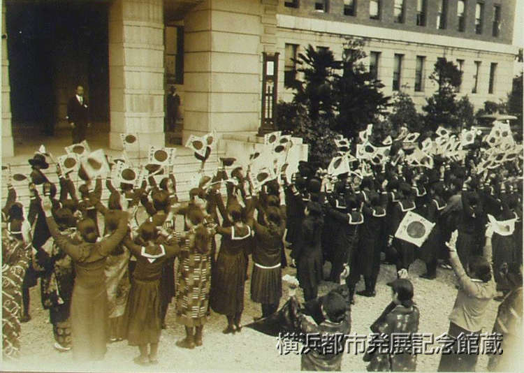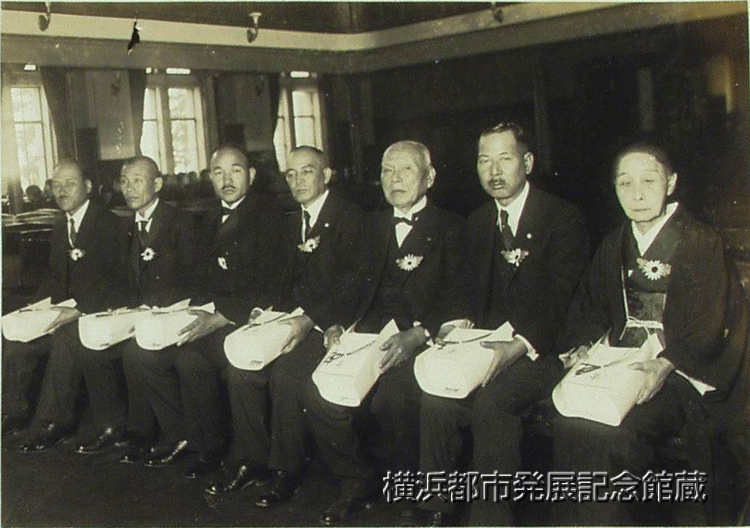 『実業教育五十周年神奈川県記念会』は本県実業教育の隆盛を祝福し将来の発展向上を期して、県下実業教育関係の官民有志を網羅して、卅日午後一時から開港記念会館に文部省菊地実業局長以下を迎へて盛大なる記念式を挙行、実業教育功労者七氏を横山知事より表彰し、夜は市内各実業学校学生々徒約五千名が参加し自動車、音楽隊を交へて大提灯行列を横浜公園より伊勢山大神宮まで長蛇の如き『火の大行進』を行つた。 (写真は表彰された渡邉たま子、唯野真琴、松浦吉松、秋山岩吉、石井伴七、安藤為次、福田縫太郎の七氏)